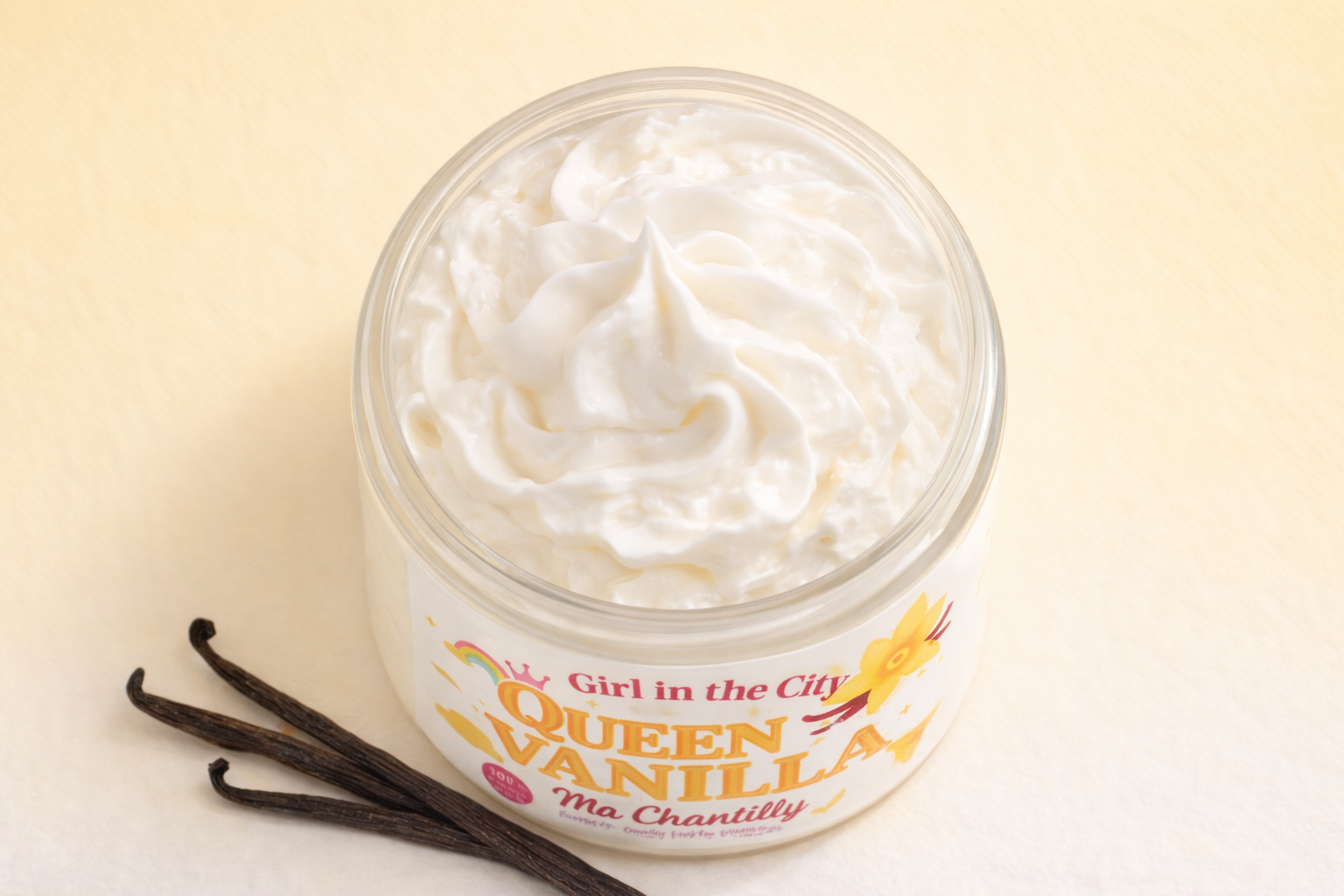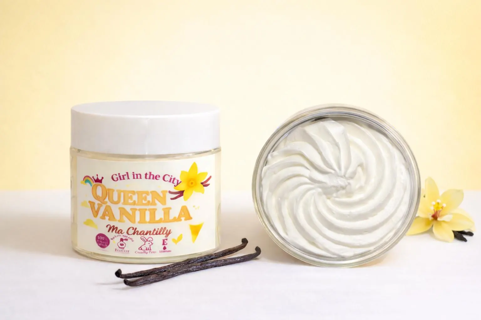 Une chantilly de karité à la vanille naturelle, fouettée à la main et formulée avec des ingrédients 100 % d’origine naturelle.